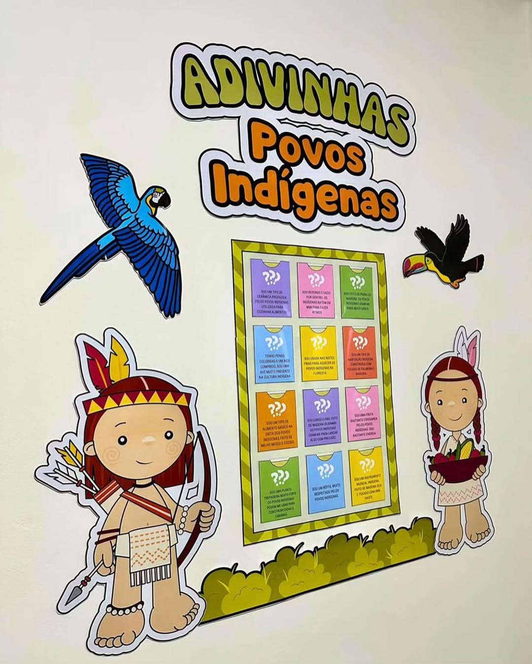 O arquivo inclui o painel decorativo ampliado e o cartaz com adivinhas em formato de envelope.