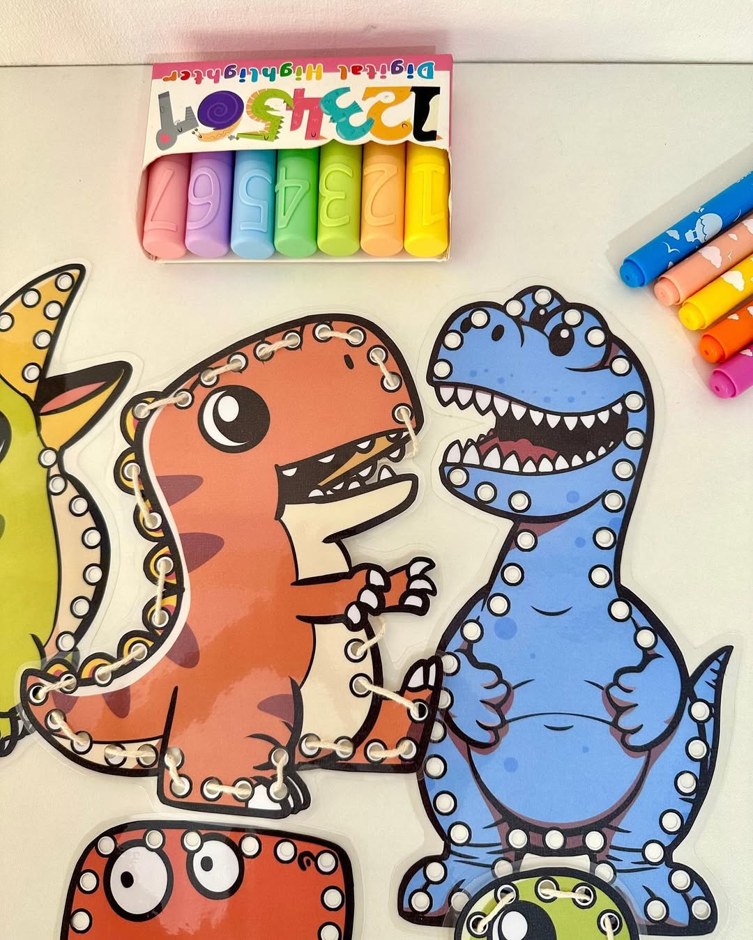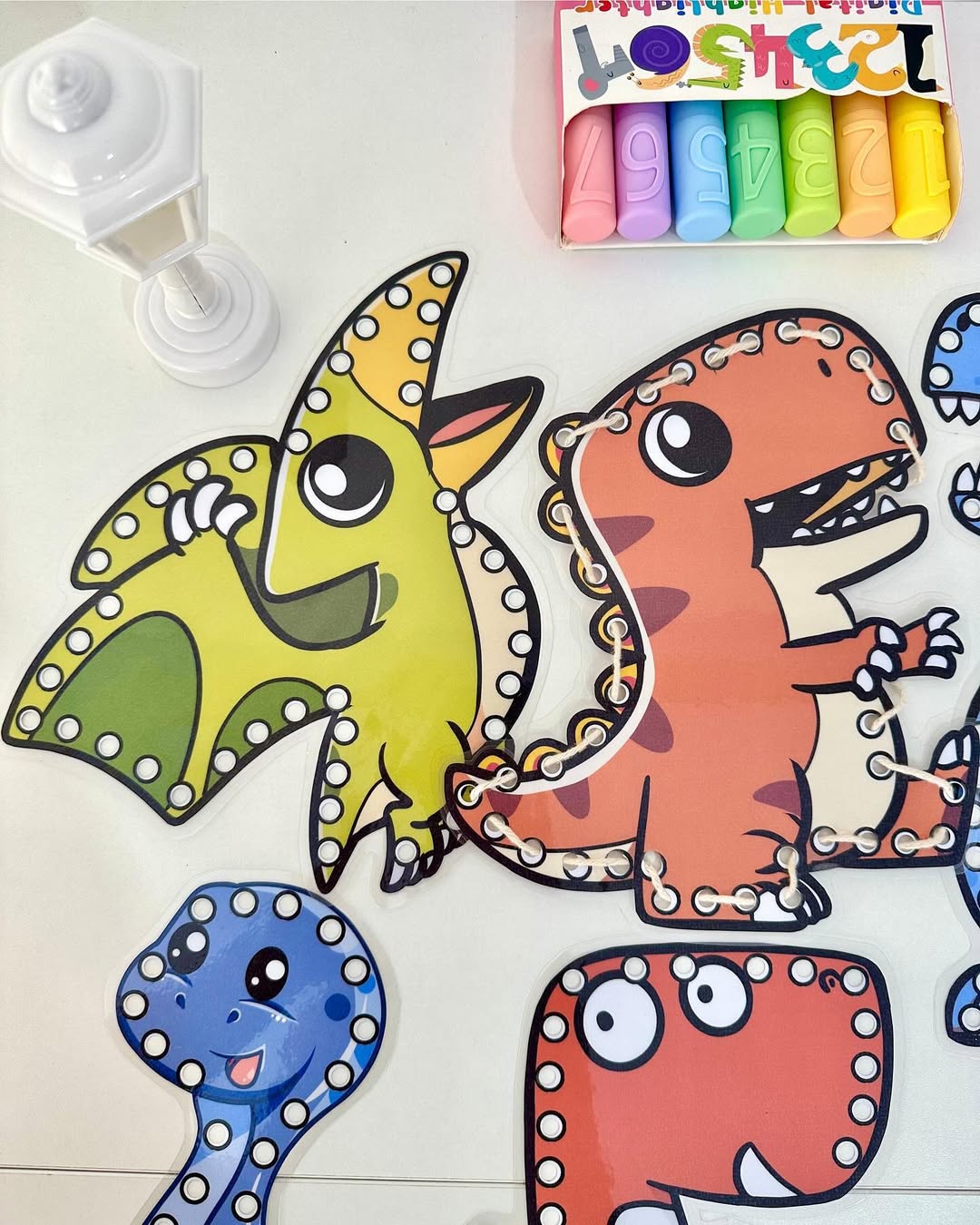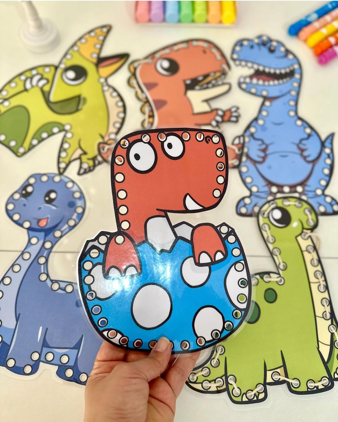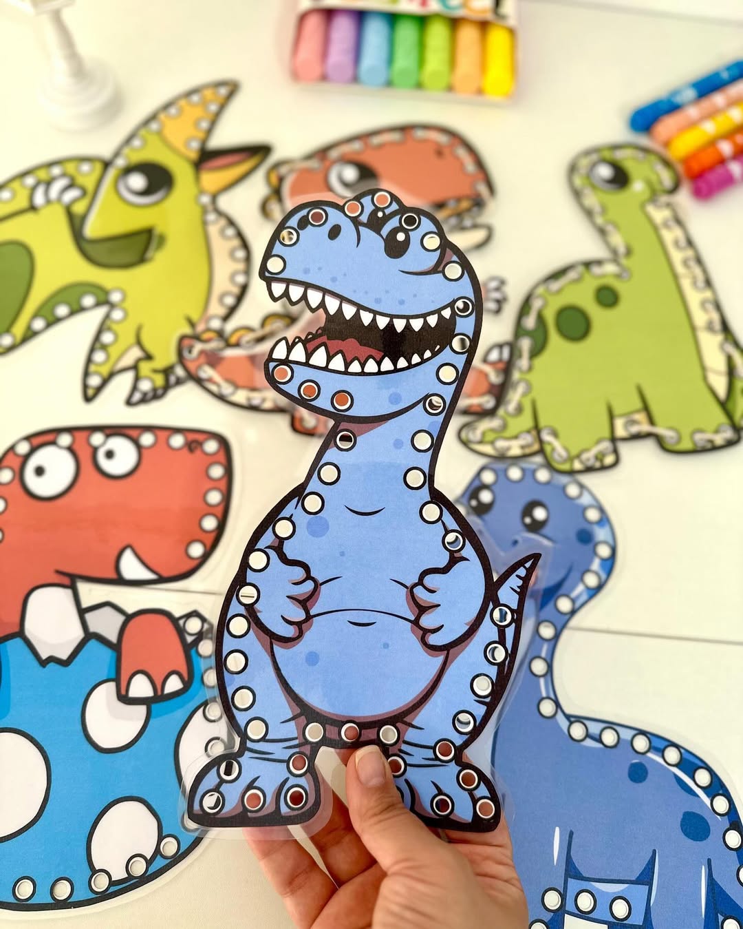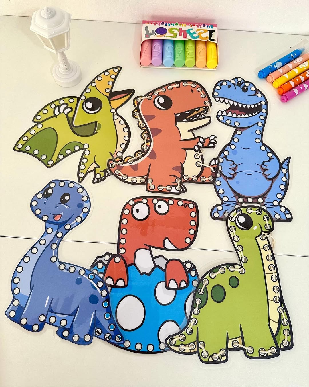 O material possui 7 dinossauros para alinhavos.
