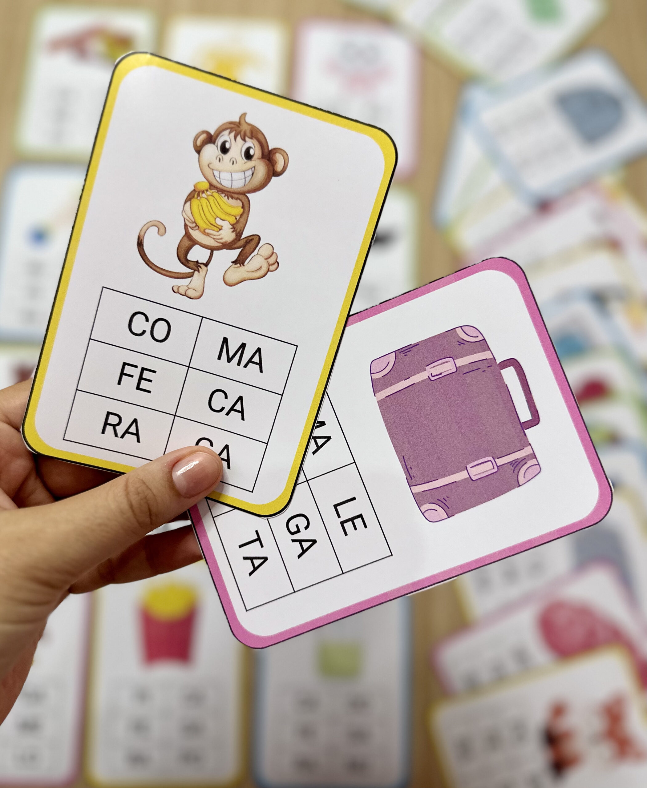O Recurso Encontre as Sílabas possui 48 fichas com palavras diferentes, para que a criança identifique e marque as sílabas correspondentes para a formação da palavra.