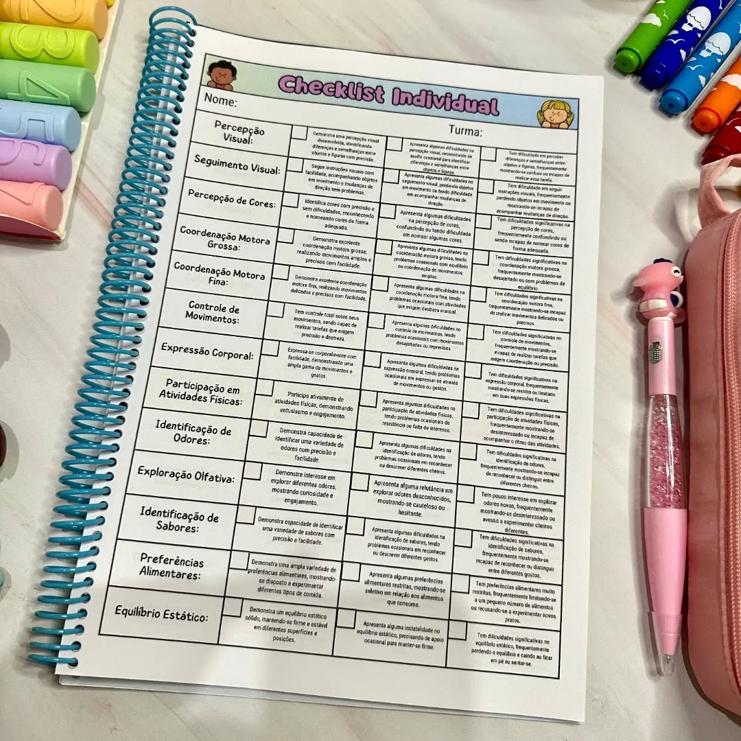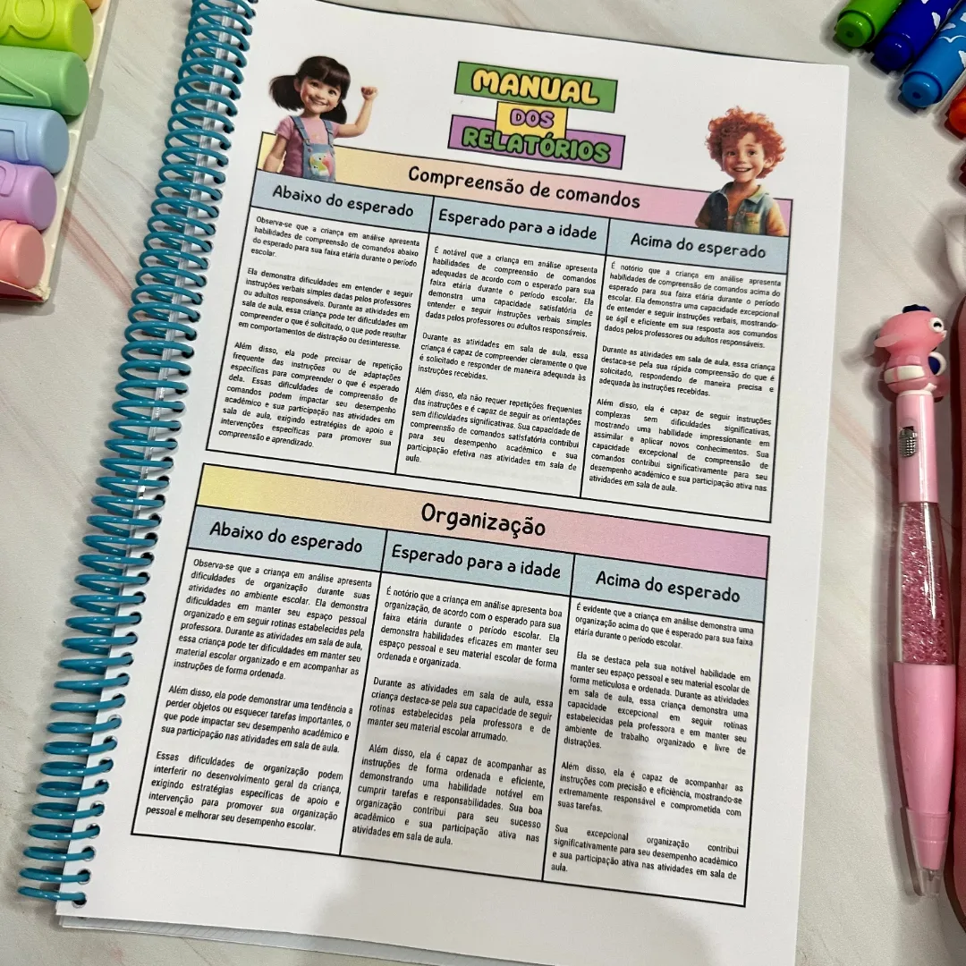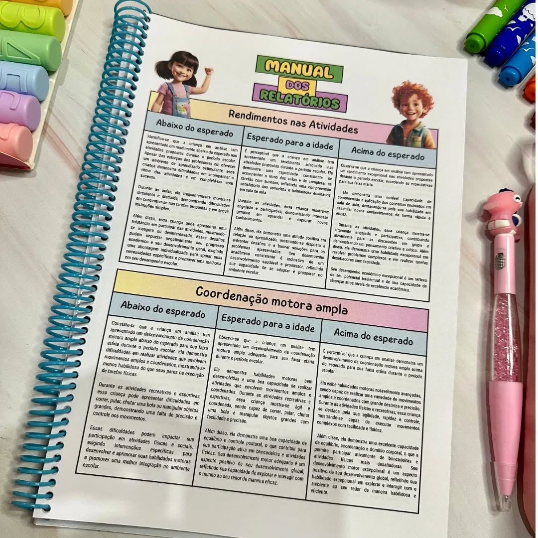Essa estrutura organizada permite que você identifique rapidamente os pontos fortes e áreas que precisam de atenção, garantindo relatórios individualizados e precisos. Além disso, o manual conta com mais de 60 textos prontos para serem adaptados e utilizados em seus relatórios. O Manual para Relatórios também inclui itens específicos para identificar sinais de alerta no desenvolvimento das crianças.